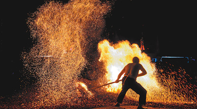 日前,浙江省金华市磐安县大皿村举行了一场非遗炼火民俗活动,吸引2000多名游客观看。炼火是磐安县独特的原生态民间艺术,流传至今已有千年历史,于2005年被列为省级非物质文化遗产。炼火者赤膊光脚、高歌狂舞、大声呐喊,同时冲进红彤彤的火炭堆上奔跑,动作粗犷有力。图为炼火者在进行表演。