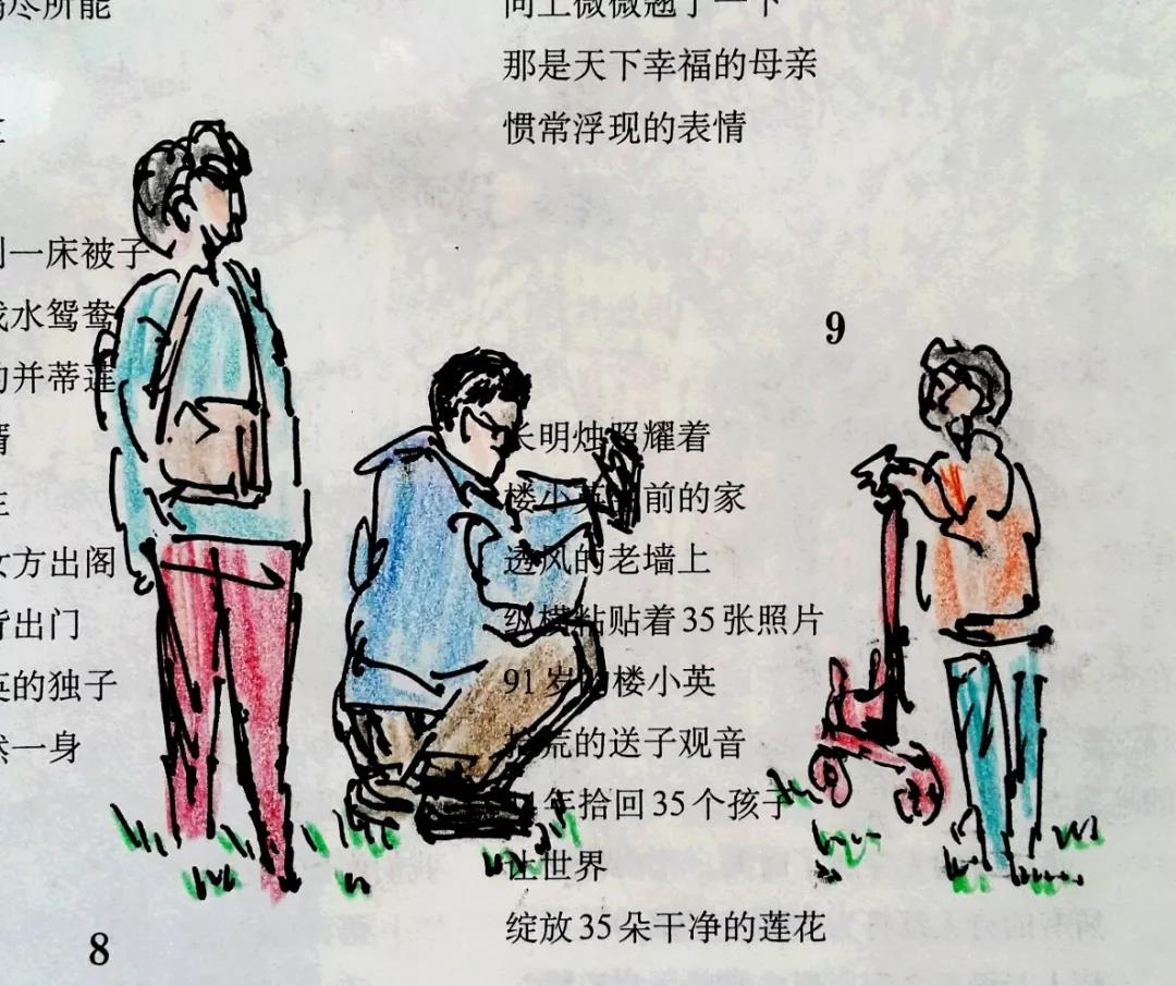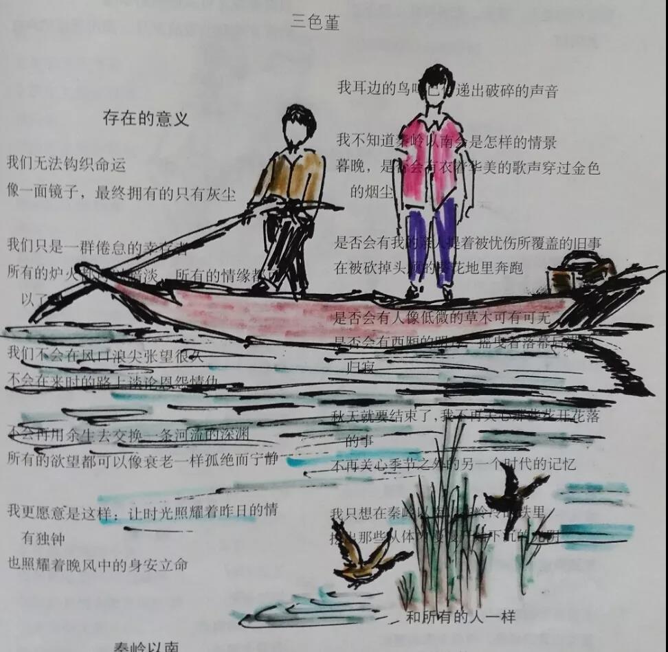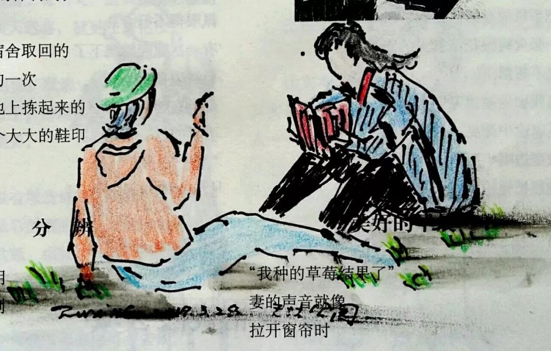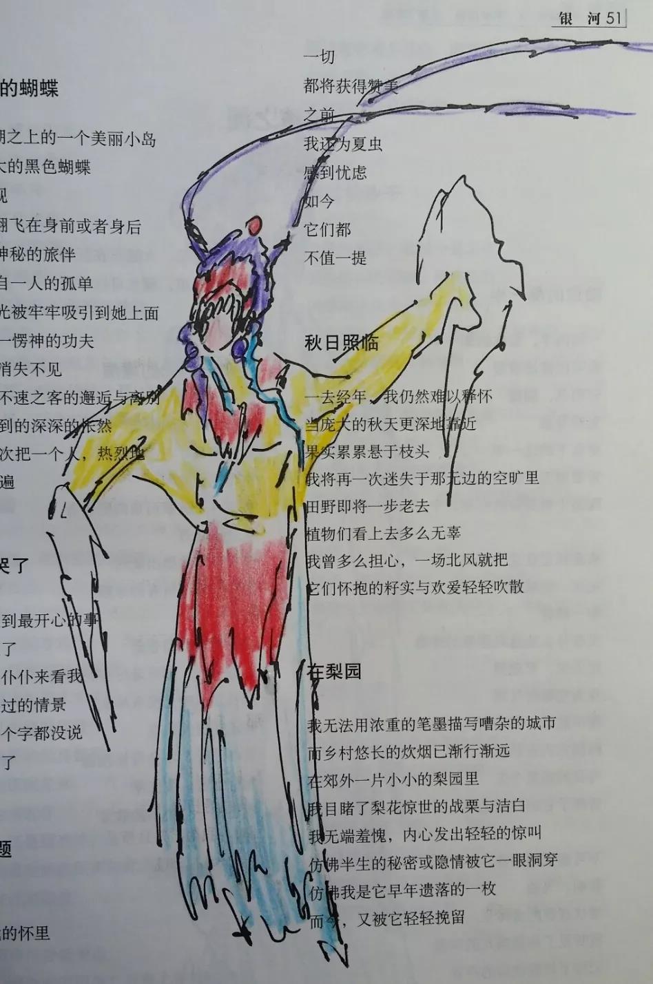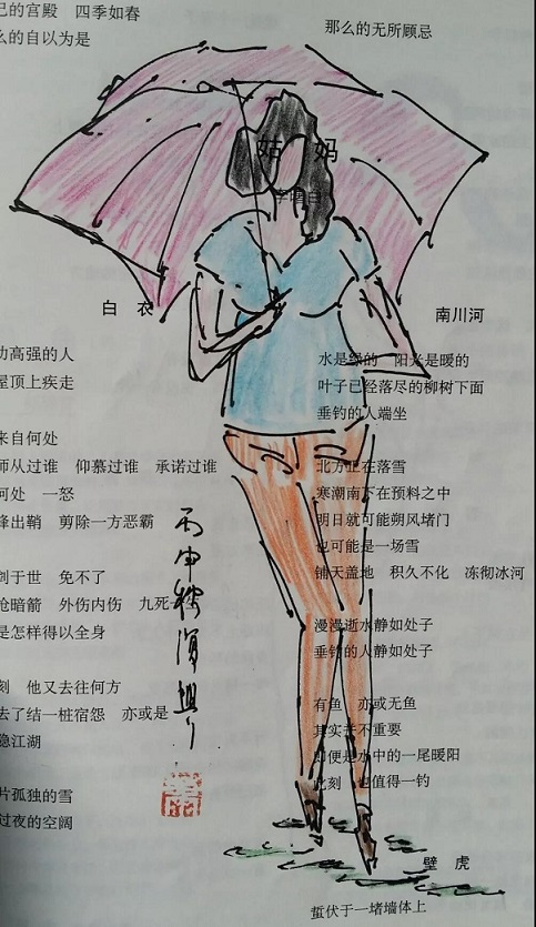 这一发现,给我自得其乐无穷。便回过头来重新看我在诗刊上画的画,居然很多张画的旁边或画里面,都有诗的题目或诗里面的句子,和画剑鞘相配,仿佛前世的默默姻缘,似乎是埋藏在那里的伏兵,等待着出其不意的袭击。原来《在梨园》并非孤例。