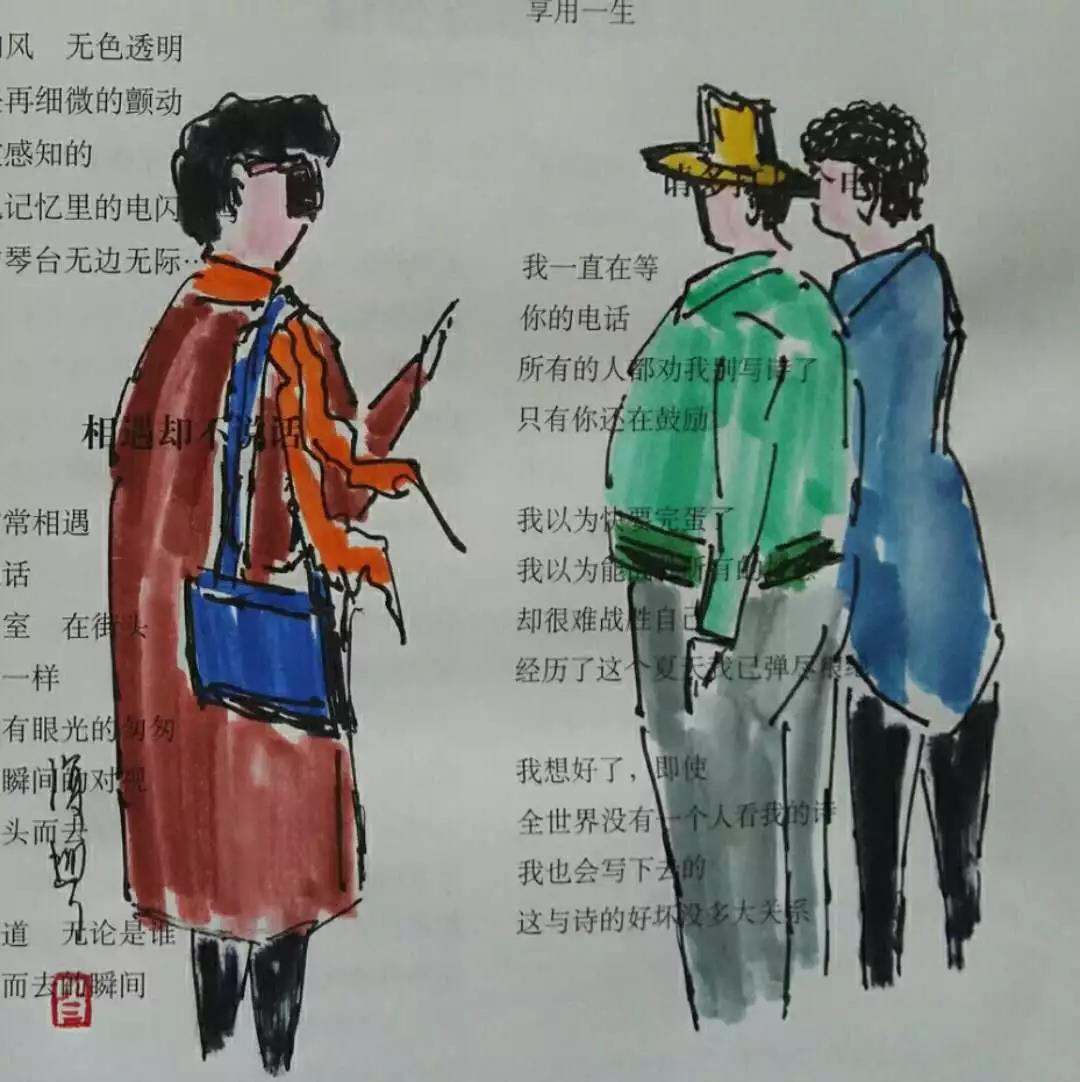中国文人画本来就讲究题诗和题句,让画与诗互文。好的诗文会给画以象外之意。诗刊上这些诗句和诗题,帮我这些无聊的画点缀出新鲜一些的生趣。这样意外的发现,让我自鸣得意,在诗刊上画画的劲头更多更浓。在我家所有的刊物中,诗刊是被利用得最充分的,也成为我最喜欢随身携带的速写本。