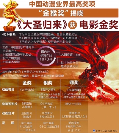 《大圣归来》曾获中国动漫业界最高奖项“金猴奖”电影金奖。新华社发
