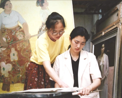 1992年,任丽君(左)和巩俐在画室。(均资料图片)