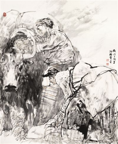 几十年如一日的外出写生,让我对如何用笔墨去反映生活感受也有点滴体会。中国幅员辽阔,风光各异,艺术感觉也随之变化。我长期生活在北方,每年都会深入北方农村生活一段时间。改革开放初期,在浙江美术学院学习时,我得以有机会去云南瑞丽傣族地区深入生活。我感到用表现河北农民惯用的以墨为主的方法,表现不出自己在云南感受到的形象,一开始画出的肖像画,总不是那种“味儿”。经过一段时间摸索,我开始注意墨与色的关系,想到应用水分的方法,去描绘人物特有的外在特征和内心世界,最终画出了满意之作。后来,我又去青海藏族地区深入生活,那里的人和物与在南方见到的又完全不同,如果用表现云南傣族所惯用的笔墨去表现藏族人民,肯定又是行不通的,进而我又探索出一套崭新的笔墨语言:以凝重的线为主、色彩为辅,吸收山水画皴法等技法,深入刻画藏族人民的性格。