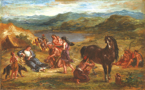 不过,德拉克瓦并不那么赞同库尔贝反映社会现实的“活力艺术”观,而更醉心于历史传说。柯姆·卡尔布强调:“德拉克瓦早在马赛尔·普鲁斯特之前,就在他的《日记》中表达了一种奇特的思想,即‘回忆与创作的平衡机理’,按照每一个体固有之模式,通过无意识记忆来实现视觉、味觉和感觉必要的融合。在他看来,凭回忆作画乃是连接所有绘图成分,保持整体和谐最可靠的方式。将现实的因素与其他文学,或更久远的创造果实相配合,定能保持其艺术特性。”柯姆·卡尔布又说,德拉克瓦受时代感应,在《奥维德隐居斯基泰人部落》一画中绘出了蓝雾缭绕的山岗和密遐的远方,仿佛进入胜境,寄托艺术家的奇异思索。德拉克瓦画古罗马诗人、《变形记》作者奥维德立在一匹紫骝雌马旁边深思,好似自己晚年仍在考量中探求“回忆机理”的画面。
