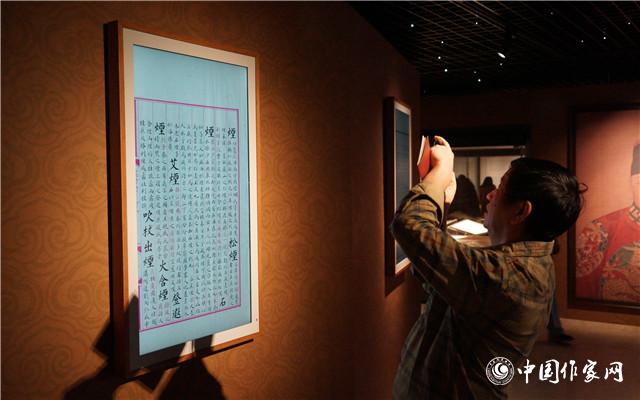 参观者在电子屏上临摹字体