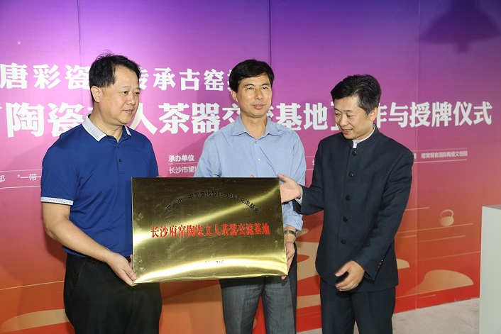 9月28日上午,在古色古乡的铜官古街府窑陶瓷文创基地,探寻大唐彩瓷•传承古窑技艺“铜官陶瓷文人茶器交流基地”创作与授牌仪式在此举行,中国少数民族作家学会秘书长赵晏彪和望城区委宣传部副部长李宏向长沙府窑陶瓷艺术有限公司总经理吴琪授牌。