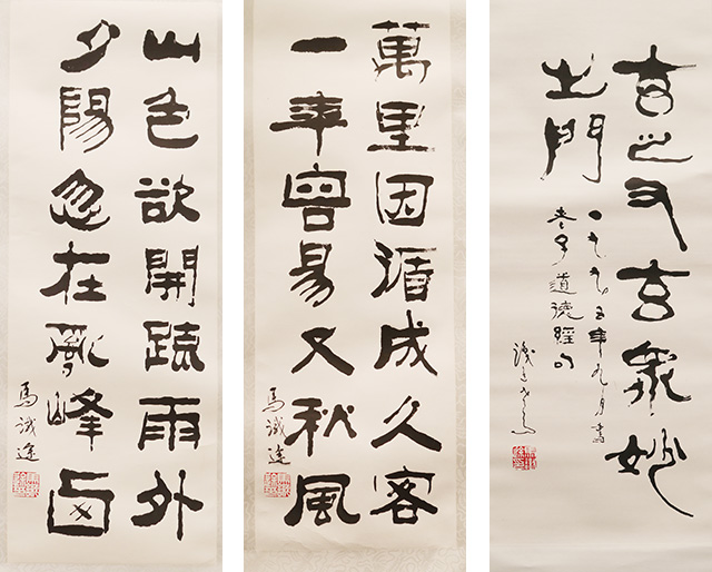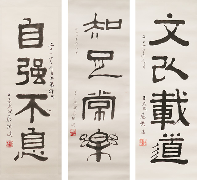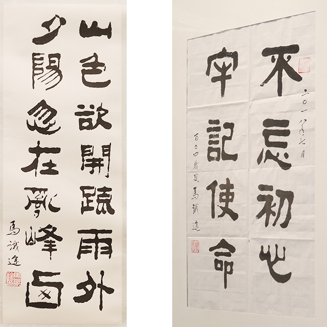 王蒙朗诵了马识途先生书法作品里的精彩诗句,并谈到这次展览是一次壮举,百岁高寿的马识途是中国文化和中国文学的“宝贝”。马识途先生自幼便临汉碑,习汉隶,他的书法凝聚着自己的人生思索和艺术追求,“能耐天磨真铁汉,不遭人妒是庸才”,“人无媚骨何嫌瘦,家有诗书不算穷”等诗句,透出了百岁人生阅历练就的通透与豁达。王蒙还向马识途先生送上自己的书法作品:“识过人间风雨书生志气亦文亦武,途经天下坎坷老马胸怀能饭能书”。
