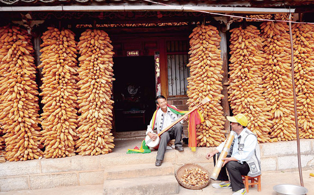 如今的阿细人,特别喜欢唱酒歌。常常是不论吃早饭还是吃晚饭,只要男子在一起喝酒,酒歌就脱口而出,吸引女子前来参唱,拍掌助兴。意犹未尽,干脆吹起竹笛,弹起三弦,拉起二胡进行伴奏。于是,歌声、笛声、弦声、掌声……汇合成响彻云霄的交响曲。