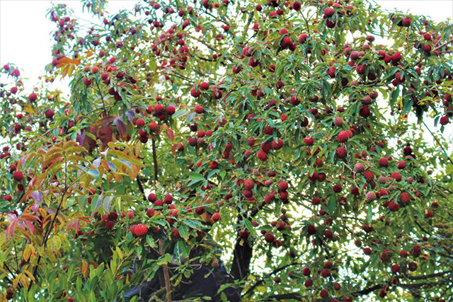 我跟着他往西边走,约两公里后,一座扁形的大山突然横亘在眼前。“看,那叫鸡素子!”李老抬手指指山腰,又指指山麓的左右两侧。我一一望去,见每一处都是“万绿丛中一点红”,真真切切,非常养眼。山麓左侧的不远处,我们走近看,见是一棵斜长在石缝里的弯树,高约4米,叉枝又生叉枝,枝条密匝,其上缀着大小形状均如荔枝的果儿,无以计数,红红火火,令人心旷神怡。