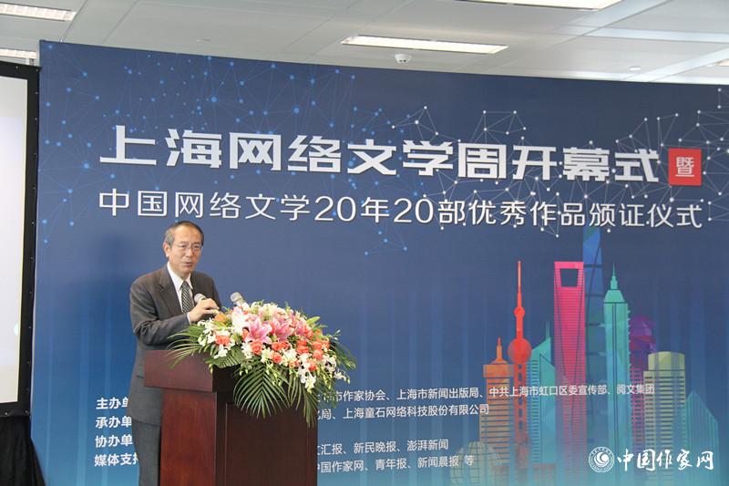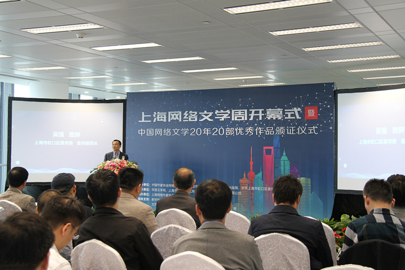 改革开放40周年,中国网络文学应运而生,20年来蓬勃发展,蔚为大观。10月22日,由中国作协网络文学中心、上海市作家协会、上海市新闻出版局、中共虹口区委宣传部和阅文集团主办,华语文学网、上海市虹口区文化局、上海童石网络科技股份有限公司承办的上海网络文学周在上海虹口区开幕。中国作协网络文学委员会主任陈崎嵘,中国作协网络文学中心主任何弘,上海市作家协会党组书记、副主席王伟,虹口区区委常委、宣传部长吴强,以及上海市有关单位负责人,来自全国的网络作家和专家学者出席开幕活动。开幕式由上海作协党组副书记、秘书长马文运主持。