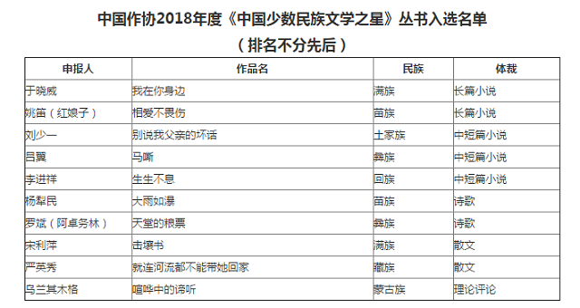 据悉,《中国少数民族文学之星》丛书,是中国作家协会从2018年起新设的少数民族文学发展工程出版扶持项目。该项目旨在借助“21世纪文学之星”丛书之光,创立培育少数民族文学新生力量和文学精英的人才工程,培养扶持少数民族青年作家、推出文学精品。中国作家协会5月15日正式发布工作条例和征集通知,截至7月15日,共收到来自各省市地方作协等单位推荐的申报选题77个。8月29日至31日,2018年度《中国少数民族文学之星》丛书评审会在京举行,评委们经过严肃、认真的审阅和充分的协商讨论,投票评选出于晓威、红娘子、李进祥、吕翼、刘少一、杨犁民、阿卓务林、绿窗、严英秀、乌兰其木格等10位作家的作品入选本年度丛书。作者当中既有荣获全国少数民族文学创作“骏马”奖的文学骨干,也有在乡镇基层工作的青年诗人,既有坚持文学创作20多年的守望者,也有近几年才开始创作的文学新人,还有优秀的网络文学作家,体现了当前少数民族青年作家创作的新成就。