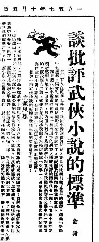 金庸1957年10月5日发表在香港《新晚报》上的文章《谈批评武侠小说的标凖》,内中明确谈到其自身的创作理念。