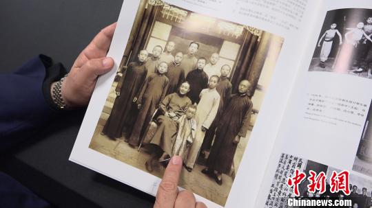 尚长荣向中新网记者介绍旧相片中的人物。 康玉湛 摄