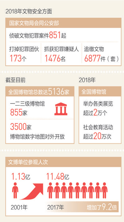 据介绍,在文物安全方面,2018年,国家文物局会同公安部开展全国打击文物犯罪专项行动,侦破案件851起,打掉犯罪团伙173个,抓获犯罪嫌疑人1476名,追缴文物6877件(套)。公安部第三批A级通缉令10名重大文物犯罪案件在逃人员全部到案。