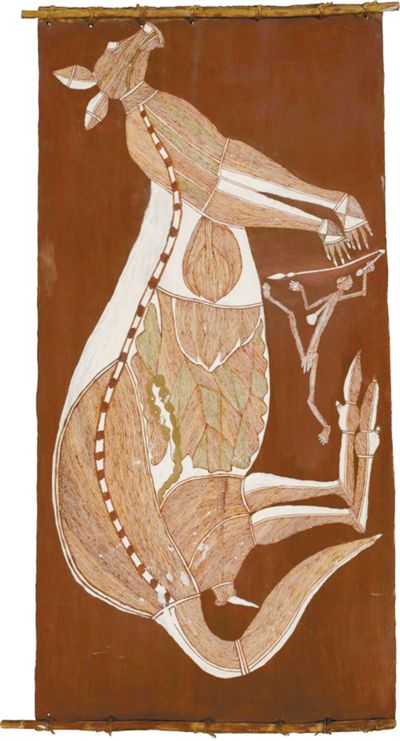 得益于延续几千年的历史和人文传统,澳大利亚树皮画带有强烈的原始艺术趣味。古老的岩画艺术、漫长的土著文化等,滋养着树皮画的发展。在取材用料上,20世纪的澳洲树皮画创作,依然保持了土著艺术的“原汁原味”。以桉树皮为画布,以赭石等矿物质为颜料。绘画工具简单便利,多是在细木棒一端固定上细长毛发制作而成,正是这种特殊的画笔,使得树皮画在艺术形式上呈现出以线条表现为主的特色。粗细不均、长短不一、弯直各异的线条,经土著“大师”们的巧妙组合、排布,再配合上平涂的点、面,一幅幅形象生动的绘画便跃然于树皮之上。