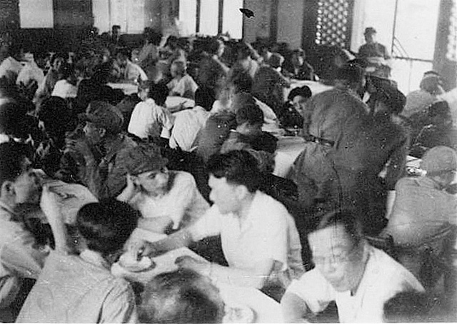 1949年,在第一次文代会上,军队代表团和华东代表团座谈,中间戴帽者为胡可,右为陈白尘,对面为岳野。