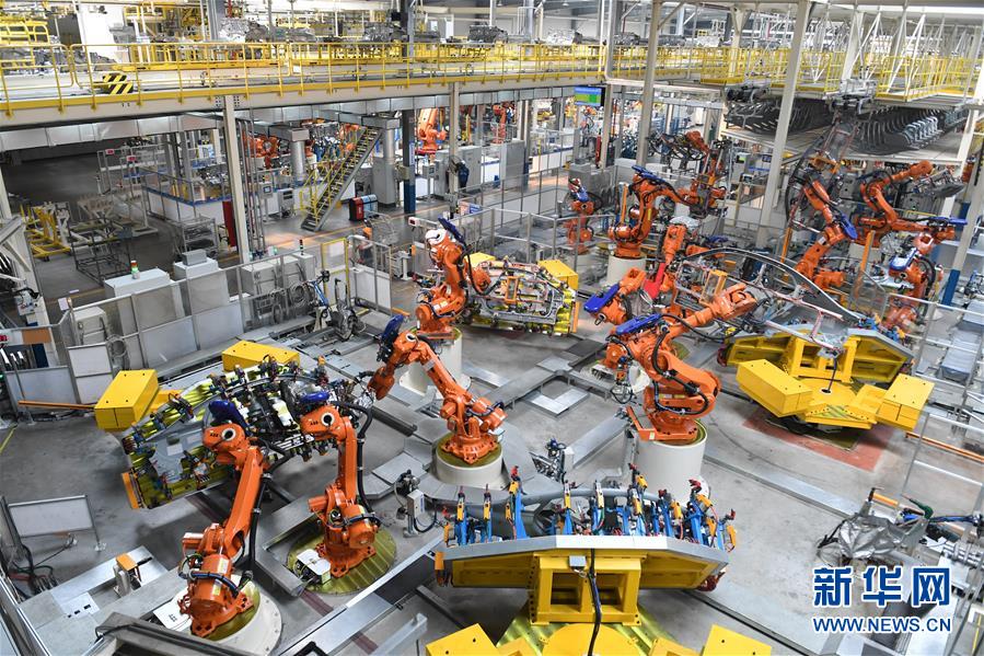 焊接机器人在浙江临海的吉利汽车生产车间工作(2018年3月27日摄)。新华社记者 殷博古 摄