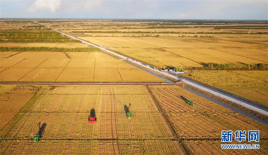 这是大型农机在黑龙江省三江平原一处稻田收割水稻(2017年9月28日无人机拍摄)。 新华社记者 王建威 摄