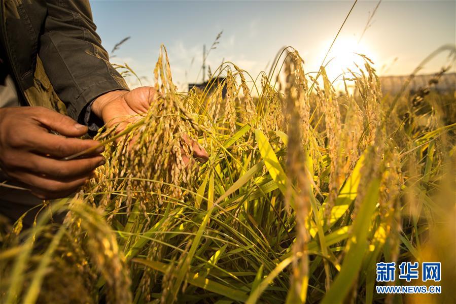 在吉林省舒兰市平安镇,农民在稻田间观察稻穗灌浆情况(2018年9月18日摄)。 新华社记者 许畅 摄