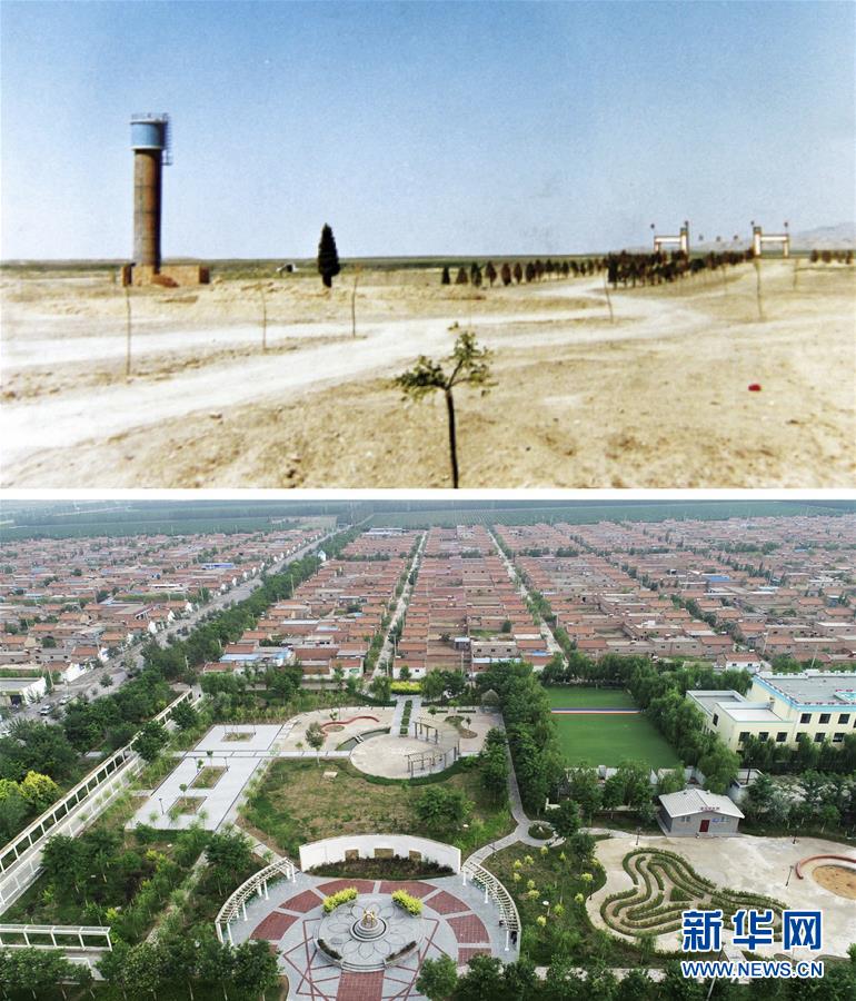 拼版照片:上图为宁夏银川市永宁县闽宁镇建设初期的资料照片;下图为2018年8月17日无人机拍摄的宁夏银川市永宁县闽宁镇原隆村(新华社记者王鹏摄)。受益于福建、宁夏多层次、多形式、宽领域、全方位的扶贫协作,闽宁镇这片曾经的戈壁荒滩,被建设成现代化的生态移民示范镇。新华社发