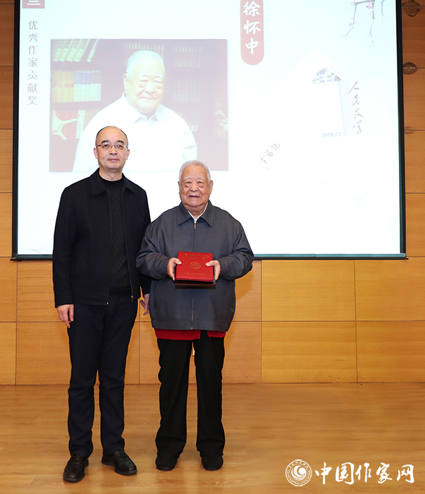 吴义勤为优秀作家贡献奖获得者徐怀中先生颁奖