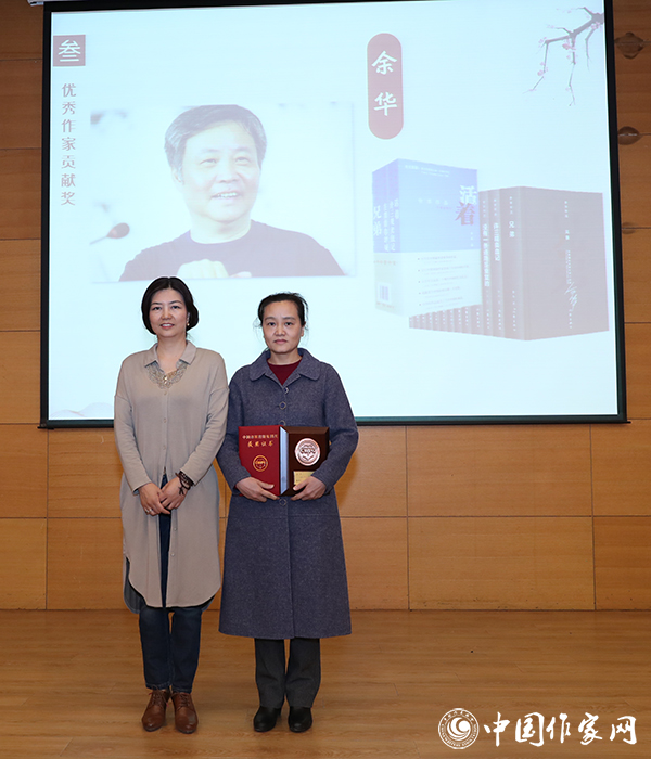 张亚丽向优秀作家贡献奖获得者余华颁奖,其责任编辑代为领奖