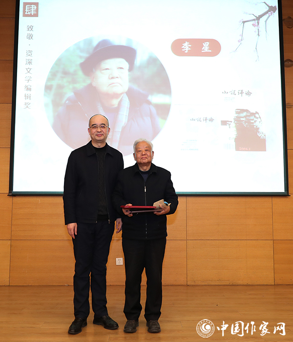 吴义勤为致敬·资深文学编辑奖获得者李星颁奖