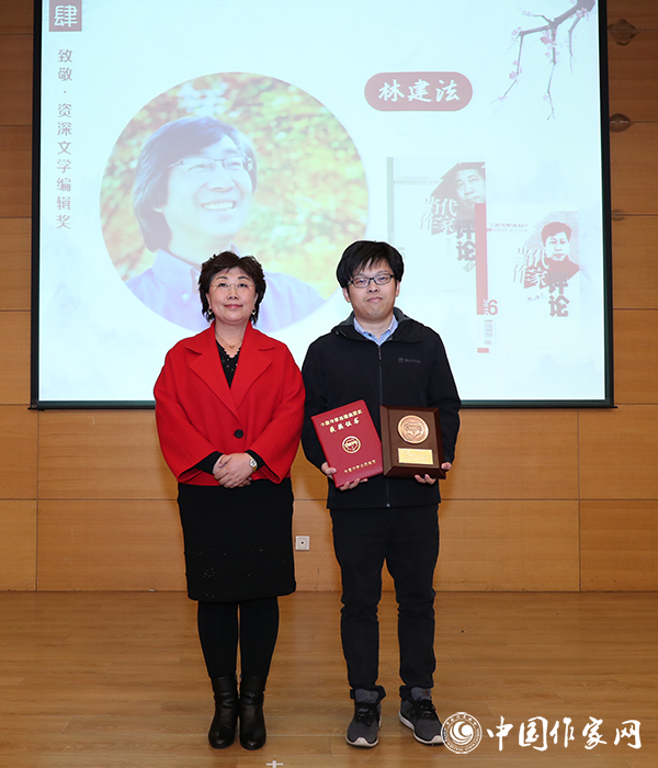 徐坤向致敬·资深文学编辑奖获得者林建法颁奖,编辑代为领奖