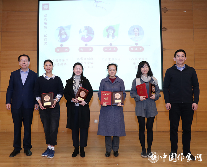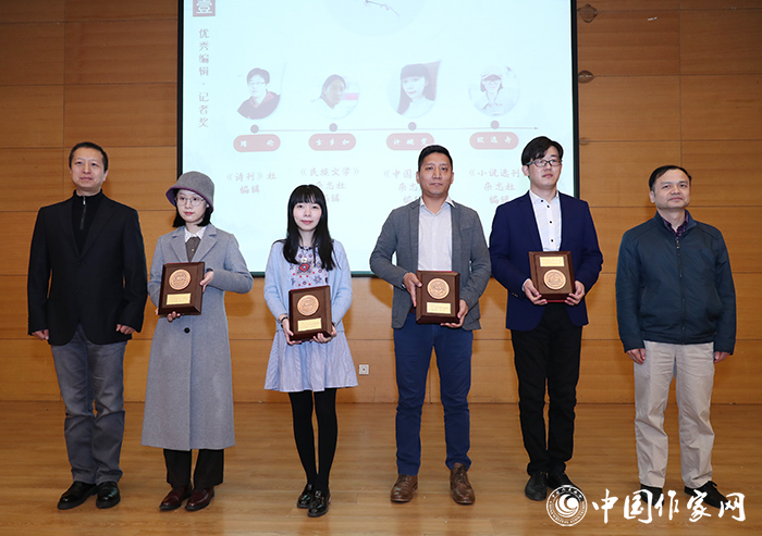 鲍坚、施战军为优秀编辑(记者)奖获得者杨海蒂、任晶晶、钱英、王婉颁奖