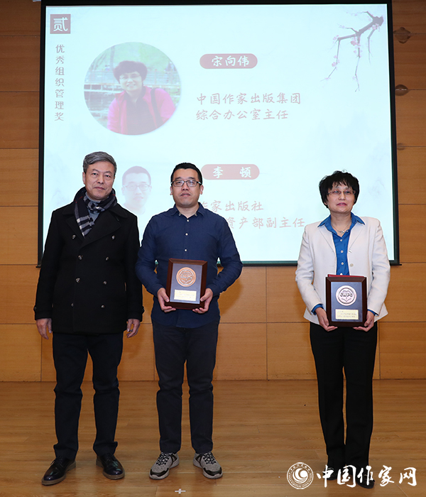梁鸿鹰为优秀组织管理奖获得者宋向伟(右)、李顿(中)颁奖