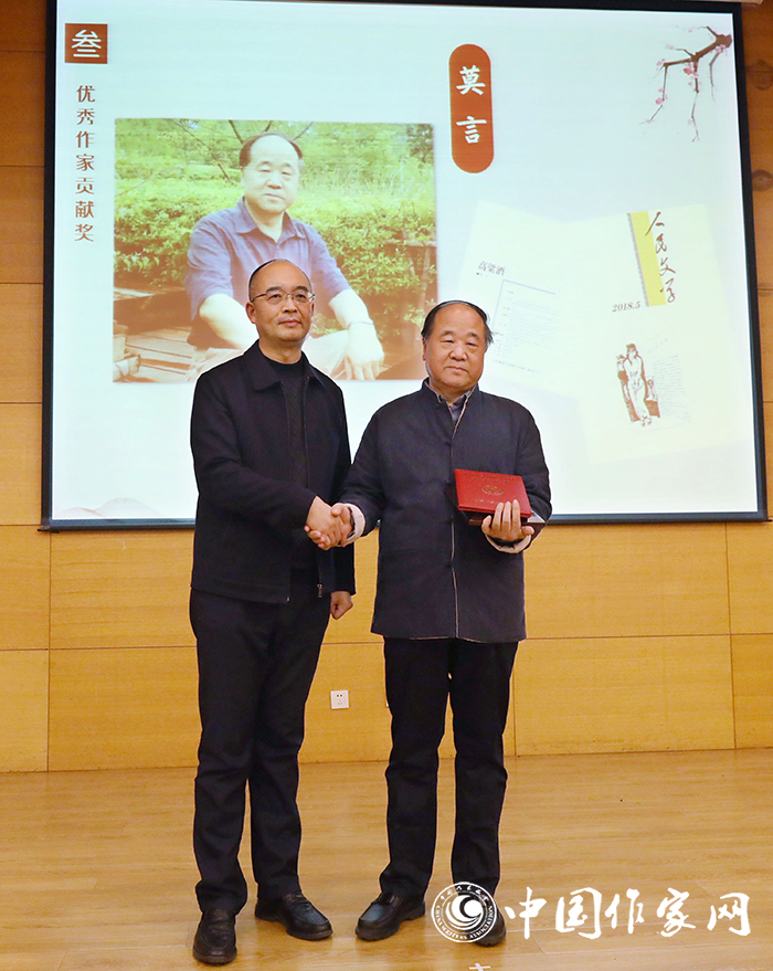 吴义勤为优秀作家贡献奖获得者莫言先生颁奖