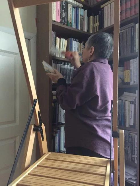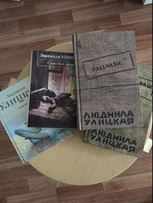随后,我们走进了一个书房。这是真正的书房,与门正对的一堵墙全是书架,几乎高到直达天花板,上面的书摆得密密麻麻,很少有空隙的地方。左面一面有窗户的两侧也有两个摆满书的书架,与窗户相对的墙根摆着一个大写字台,上面有电脑以及一些文具之类,我想这里大概是女作家经常写作的房间。站定后,乌利茨卡娅指着窗户左侧的书架说,这些都是我出版的书。我顺着他指的方向看去,约有十层的书架上面摆满了各种版本的书,那是女作家几十年来辛勤劳作的成果,我看着那些书顿时对这位女作家肃然起敬。这时候,乌利茨卡娅喊了一声:“安德留沙,请把梯子搬来!”我心想,有雅科夫的梯子,怎么乌利茨卡娅也有了梯子(她说还是从意大利买的)?原来,她是要登梯子取几本书送给我,这时我才明白她要丈夫搬来梯子的用意。说话间,她丈夫就把梯子从自己的雕塑作坊搬来了。乌利茨卡娅麻利地爬上梯子,一下子给我取下来7本书,还问我够不够?她的慷慨令我感动,7本书足矣,我已经不好意思再要了。