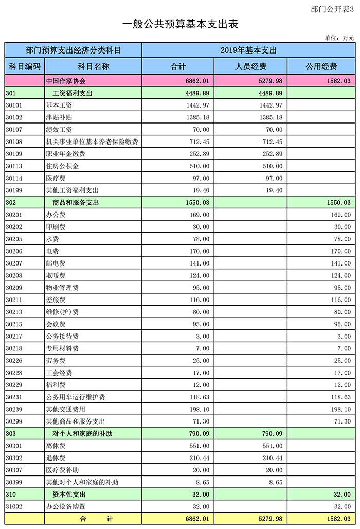 中国作家协会2019年一般公共预算基本支出 6862.01万元,其中: