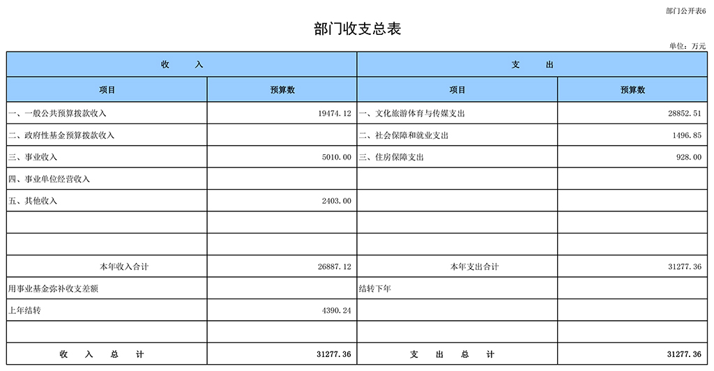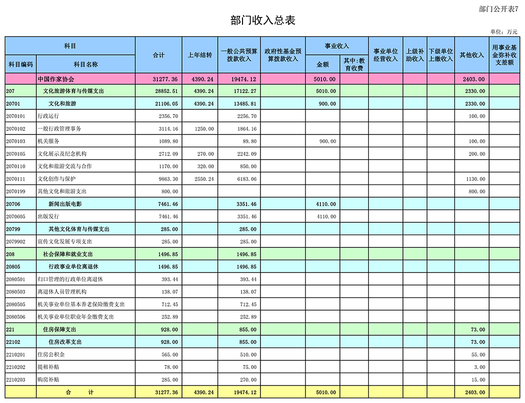 按照综合预算的原则,中国作家协会所有收入和支出均纳入部门预算管理。收入包括:一般公共预算拨款收入、事业收入、事业单位经营收入、其他收入、上年结转。支出包括:文化旅游体育与传媒支出、社会保障和就业支出、住房保障支出。中国作家协会2019年收支总预算31277.36万元。