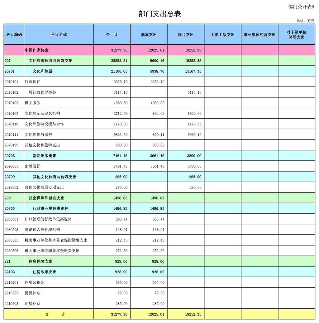 (八)文化旅游体育与传媒(类)文化和旅游(款)一般行政管理事务(项):指中国作协本级组织作家深入生活等文学活动所需的项目支出。