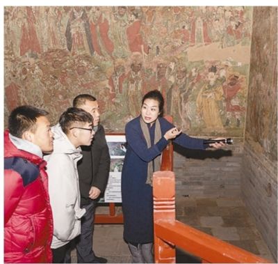 武育红(右一)为游客讲解毗卢寺壁画。 本报记者 张腾扬摄