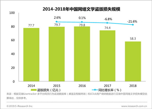 据艾瑞咨询发布的统计显示,2018年中国网络文学整体盗版损失规模为58.3亿元,相较2017年降低了21.6%。