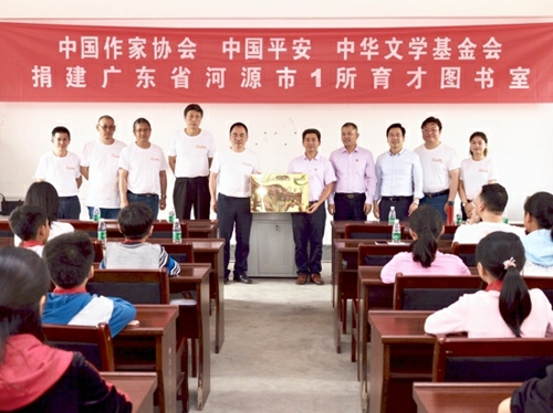 9日下午,“育才图书室”授牌仪式在紫金县举行。杨黎光、肖克凡、胡性能、王十月、李晓东等采风团成员及中华文学基金会项目负责人刘娜、中国平安集团扶贫办常务副主任陈遥等参加授牌仪式。