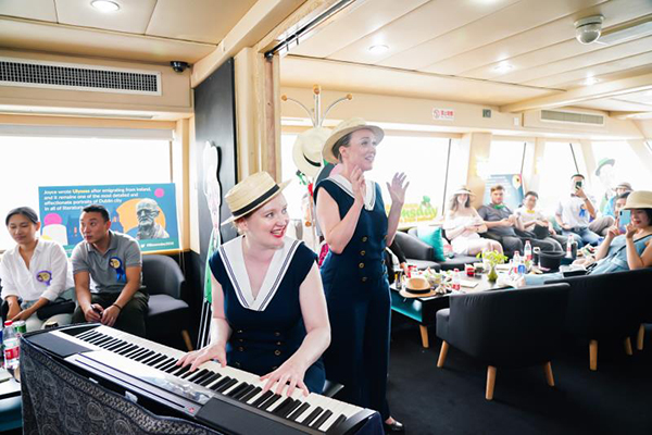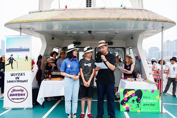 上海作为文化艺术重地,爱尔兰驻上海总领事馆已经连续多年举办生动热烈的活动来庆祝布鲁姆日。6月16日的黄浦江畔,烈日灼灼,一群戴着彩色领结、爱尔兰草编帽和白色羽毛胸针的游客显得格外引人注目。在江边游轮上,摆放着布鲁姆的巨幅彩色画像,还有手风琴、竖琴和一摞摞厚厚的《尤利西斯》。走进船中,宛如置身《尤利西斯》中的经典场景,如:Joyce画廊、Davy Byrne酒吧、Molly的客厅、及Sandymount Strand海滨。宾客们身着斑斓的礼服,品尝着都柏林风味的芝士蛋糕,在奏响的音乐声中探访乔伊斯的内心世界。