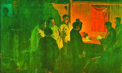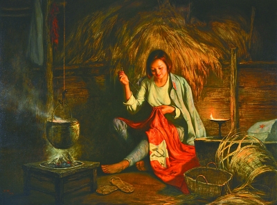 王忻的《永恒的信念——女红军》生动刻画了一名正在油灯前缝制旗帜的女红军。人物身后的稻草和房间里堆砌的杂物显示出战争年代生活环境的恶劣。在灯光的映照下,女红军面部的表情清晰细腻,专注的眼神闪烁着希望的光芒,传递出共产党员坚定的理想信念。