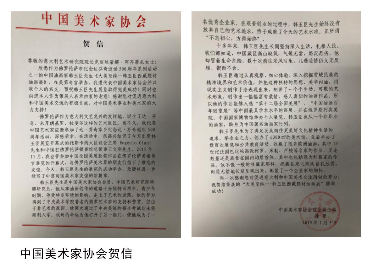 徐里在贺信中说:“佛罗伦萨作为意大利文艺复兴的发祥地,诞生了达•芬奇这样的艺术巨匠。今天,韩玉臣先生的展览无疑将进一步加深中意美术界之间的友谊。韩玉臣先生是中国美协会员、中国美协油画艺委会名誉委员,他从事油画创作的道路十分独特而艰辛。他对艺术的热情萌生于青少年期间,但由于非艺术的原因,两次通过了中央美院的招生考试却未能顺利入学。坎坷的命运为他打开了另一扇门,使他成为了一名优秀企业家。在艰苦创业的过程中,韩玉臣先生始终没有放弃自己的艺术追求,10多年来,坚持深入生活,数十次到藏族地区,遇到过好多次险情,然而他始终锲而不舍、义无反顾。他通过认真观察体验、深入挖掘雪域民族的艺术价值、高原使命,把这种独特的思想、美学内涵,用现实主义表现形式表现出来。所以他的作品能够入选“第十二届全国美展”、“中国油画百年回望展”等最具学术水平的画展。韩玉臣从一个非职业的画家,跻身为中国著名油画家行列。”