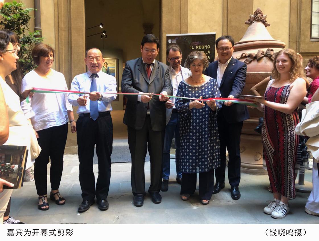 在参加开幕式嘉宾的热烈掌声和期盼中,中国驻意大利佛罗伦萨领事馆总领事王文刚、意大利艺术研究院院长克丽丝蒂娜•阿齐蒂尼和画家韩玉臣为展览剪彩。