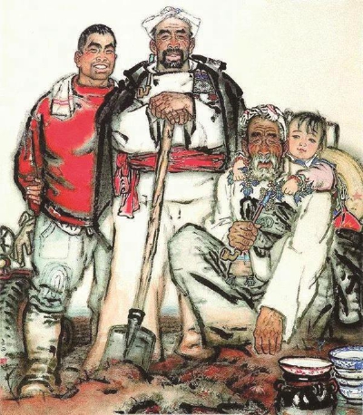 左图:刘文西的画作《祖孙四代》。(资料照片)
