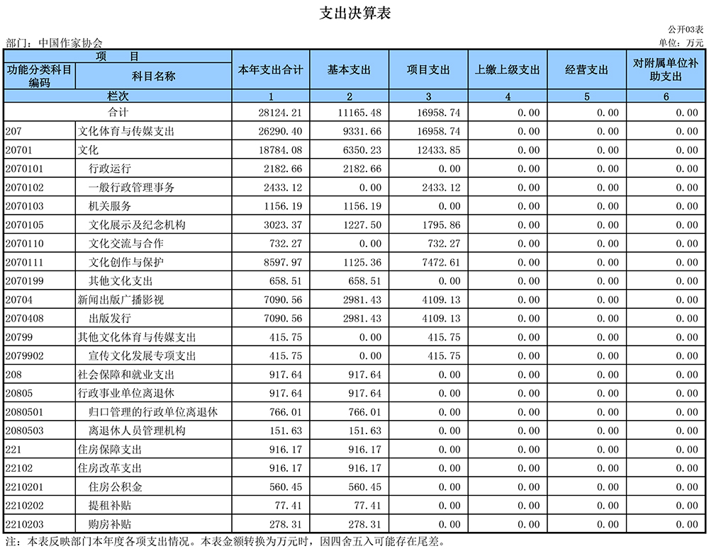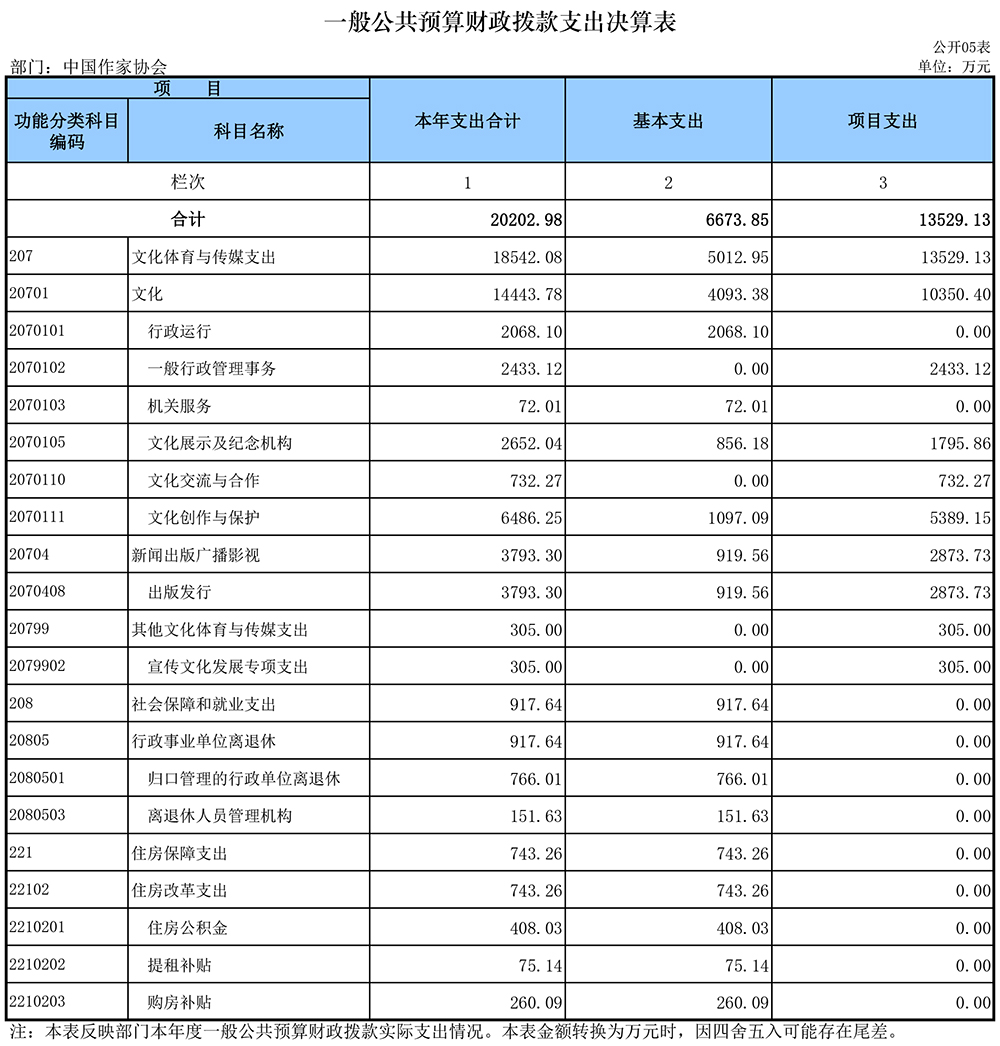 七、文化体育与传媒(类)文化(款)行政运行(项):指中国作协本级行政人员工资及机构正常运转、履行职责所需的基本支出。