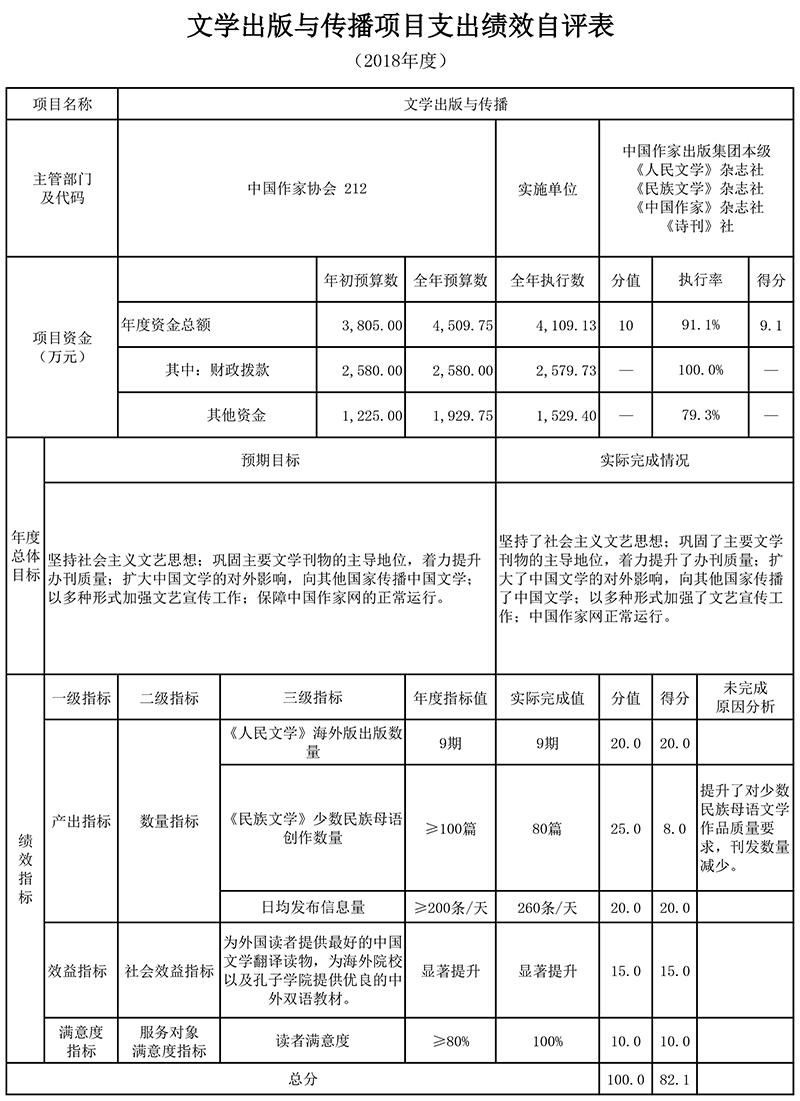 2.“文学出版与传播项目”绩效自评综述:根据年初设定的绩效目标,项目自评得分为82.1分。项目全年预算数4,509.75万元,执行数为4,109.13万元,完成预算的91.1%。项目绩效目标完成情况:坚持了社会主义文艺思想;巩固了主要文学刊物的主导地位,着力提升了办刊质量;扩大了中国文学的对外影响,向其他国家传播了中国文学;以多种形式加强了文艺宣传工作;中国作家网正常运行。发现的主要问题及原因:一是部分绩效指标设置不科学,不利于绩效评价和实际工作的开展,执行过程中完成难度较大;二是文学刊物的发行需要进一步提高。下一步改进措施:根据项目目标要求和实际工作开展情况,合理设置绩效指标,着力突出文学刊物的受众面和影响力。