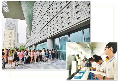 左图 在首都博物馆门前排队等待入馆的参观者。 下图 带着博物馆任务单来参观的学生。廉 丹摄