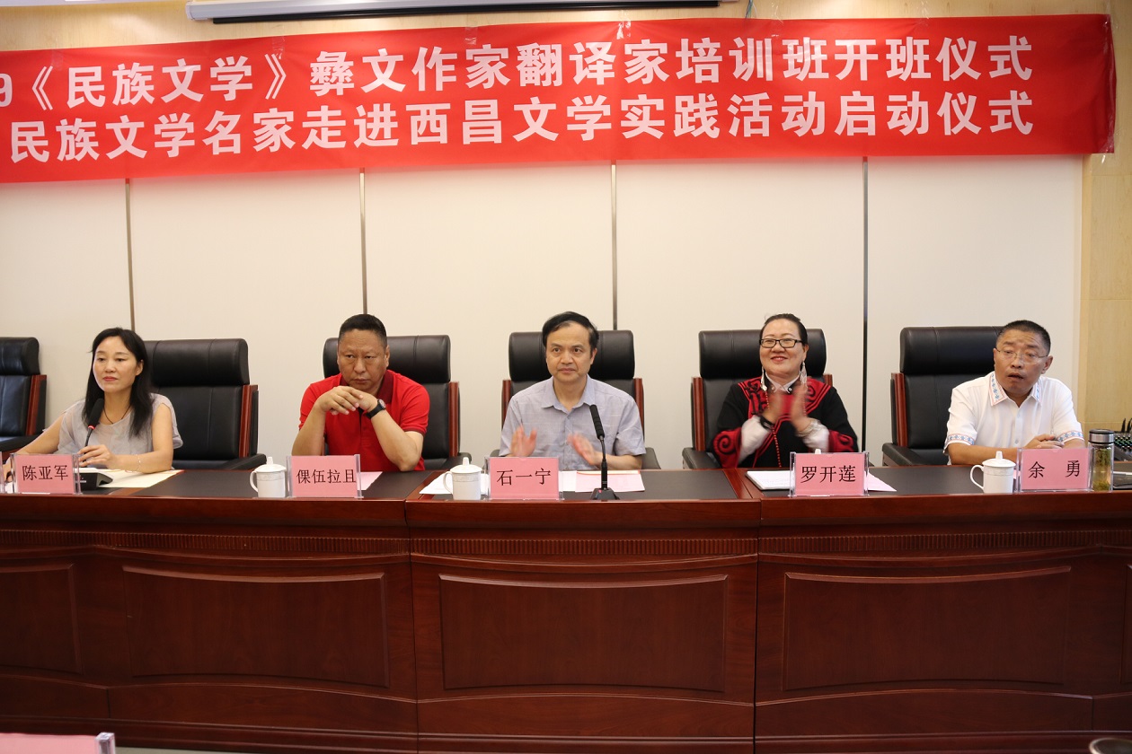 7月24日至26日,由《民族文学》杂志社和西昌市文联联合主办的“2019《民族文学》彝文作家翻译家培训班暨多民族作家走进西昌文学实践活动”在四川西昌举行。《民族文学》主编石一宁,四川省文联副主席、作协副主席倮伍拉且,西昌市人大常委会主任罗开莲,西昌市委副书记余勇,及作家黄宾堂、王谨、韩小蕙、郑万里、夏鲁平、王妹英等,和彝文作家、翻译家共四十余人出席。开班仪式暨文学实践活动启动仪式由《民族文学》副主编陈亚军主持。