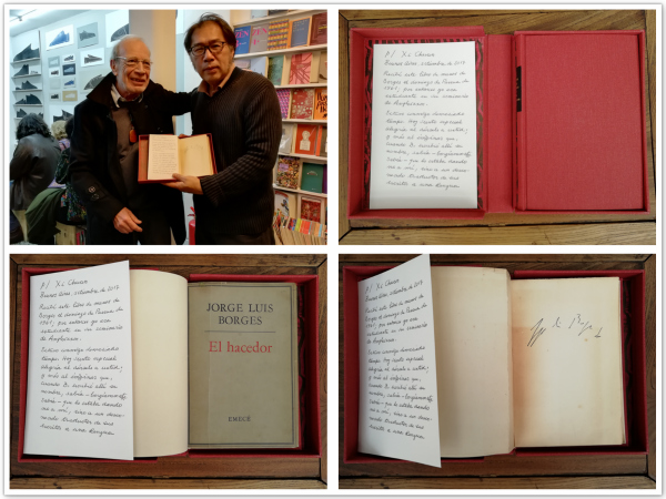 2017年9月在阿根廷布宜诺斯艾利斯,博尔赫斯学生卡洛斯.R.路易斯将博尔赫斯签名本《创造者》一书赠与西川