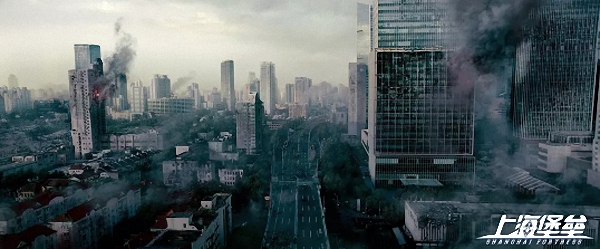 就这个角度来看,《上海堡垒》可以说是一下子走出去一大步。一直以来,出于各种规则或者潜规则,国产电影都尽量回避具体的城市名字。《上海堡垒》这一次非但做到了城市名称完全实化,而且把上海的地标建筑毁了个十足过瘾。甭管是外滩这一边的万国建筑群,还是静安寺啥的,都烟火纷飞千疮百孔。在电影里呈现出这样一种熟悉画面的陌生模样,有一种更强烈、更直接、更刺激的美感。尤其是东方明珠塔附近的江面上出现一个大坑,汤臣一品的房子一栋接一栋塌进去,这画面比过去欣赏好莱坞电影里的任何一处建筑被毁,都更能撩人心弦。