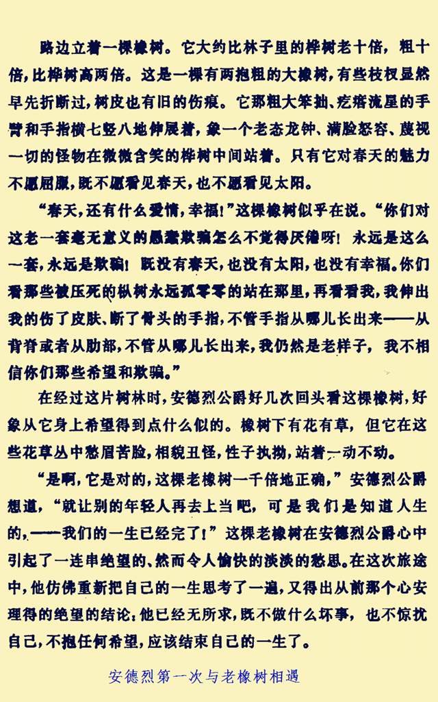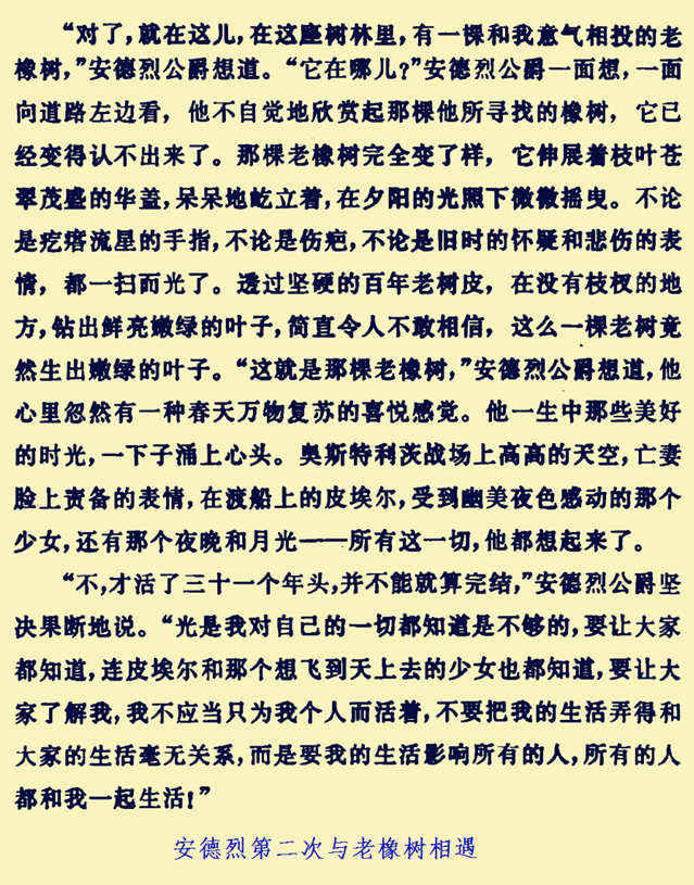 托尔斯泰善于通过描写心理变化的过程展示人物思想性格的演变,俄罗斯文艺理论家车尔尼雪夫斯基将这种艺术特色命名为“心灵辩证法”。《战争与和平》中的著名片段“安德烈与老橡树的两次相遇”即运用心灵辩证法的方式写出了安德烈的内心转变。