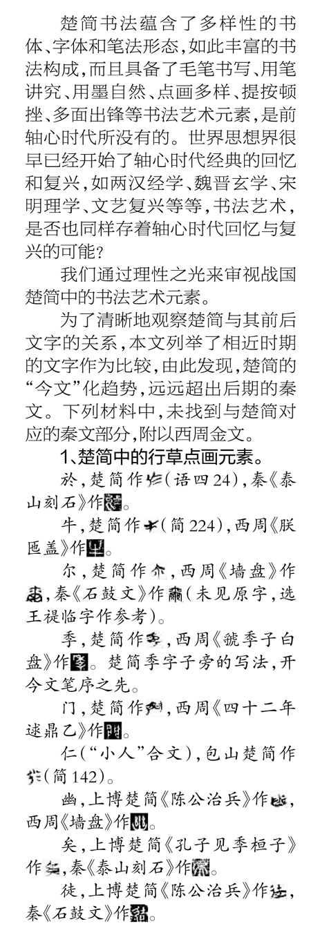 战国楚简,是当前出土最多的轴心时代经典文献,其简书墨迹中显现了隶变的发端。从楚简文字的“今文”化、多元性书法元素来看,楚简“经典书变”的方向并非限于“隶定”,下面以楚简为例论述。